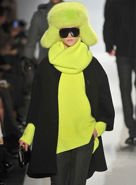El look de la foto es un ejemplo: los colores neón se combinan con negro, y lejos de aparecer en un corte demasiado informal, están en dos prendas de lo más casuales pero elegantes. Una ligera variante en el suéter o en el gorro, un error de cálculo, harían que el sistema rompiera su equilibrio. Pero estamos hablando de Michael Kors.