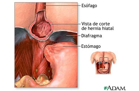 La «hernia hiatal« es una afección en la cual una porción del estómago sobresale dentro del tórax, es un cuadro médico que se trata cuando la parte superior del estómago se agranda mediante una abertura en el diafragma.