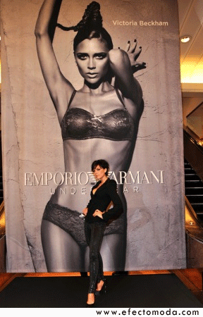 La nueva campaña de lencería del Emporio Armani para el otoño/invierno de 2009/10 fue revelada en un baner de más de seis metros en la tienda Macy’s de Herald Square en la ciudad de Nueva York. Allí la protagonista de la campaña, Victoria Beckham, compartió un poco con sus fanáticos, luciendo muy a la moda, como siempre, en unos leggings con cristales Swarovski y tacones de plataforma.
