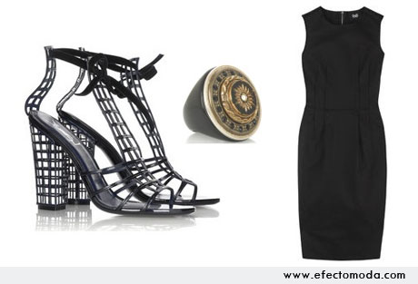 Las sandalias se pueden mezclar con un vestido de color negro como este de D&G, un anillo de gran tamaño de rings eclectic adornado con varias piedras que es uno de los accesorios recomendados para este verano, además está hecho de acrílico con detalles de bronce de color dorado y con una estrella en su mitad.