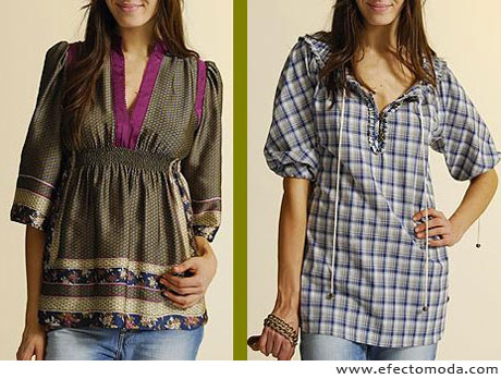 Los blusones que se aprecian en la imagen anterior siguen con la propuesta de moda que Mango propone para esta próxima temporada. El de cuadros azules además de ser perfecto para combinar con jeans tanto azul celeste como azul marino, hace un buen balance entre el escote en «v» y las magas a los codos. El primer blusón tiene detalles color morado oscuro, tono propio de los diseños otoñales, y muy oportuno para combinar con el gris oscuro que predomina en la prenda.
