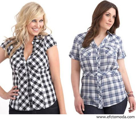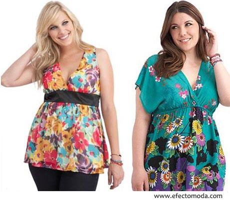 La tela estampada, igualmente puede aparentar mayor anchura y darle poca forma al cuerpo, y sí se trata de tallas grandes, lo que menos se desea es lucir como un recto costal. En diseños como los dos anteriores es apropiado agregar un resorte o banda que ajusta la blusa en la parte inferior del busto, así se disimula el vientre y se hace resaltar el escote.