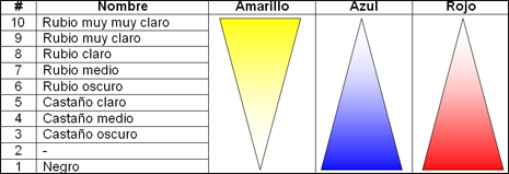 Anteriormente se clasificaron los tintes en dos grupos básicos: los tonos naturales y los tonos reflejos. Los primeros son una gama de tonos entre el rubio muy muy claro y el negro, pasando por los castaños. Estos se componen, regularmente, de la mezcla de proporciones de tinte amarillo, azul y rojo, como se puede apreciar en este gráfico: