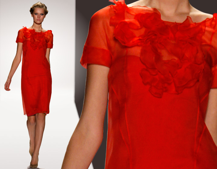 Los materiales más utilizados son organza, raffia, y seda, telas características por su movimiento, caída y frescura. Los colores más llamativos de la colección fueron los rojos, amarillos, verdes, crema y el clásico negro en todas sus degradaciones.