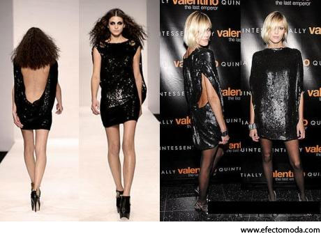 Una estrategia usual es la de las prendas que frontalmente lucen bastante sencillas y sorprenden con un escote espectacular en la espalda, como el minivestido negro de lentejuelas de la imagen.
