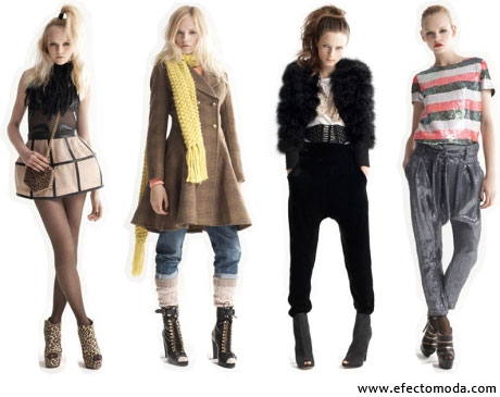 Topshop también atiende la tendencia de las estolas, los flecos y la ropa baggy. En está última, tiene a bien integrar colores no muy oscuros, aunque sí opacos, como en el atuendo a la derecha de la imagen. Pantalón con pinzas y prendas como salpicadas por pintura blanca logran una apariencia llamativa entre los conjuntos oscuros gracias a la luminosidad del color blanco y el rosa.