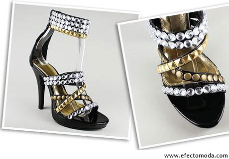 De correas cruzadas, base negra y altos casi de aguja, el gran identificador de estas sandalias son las hileras de tachuelas, estoperoles y piedras cristalinas que hacen a este par una alternativa de calzado, literal y figuradamente, brillante.