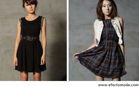 En la imagen se pueden apreciar dos buenos ejemplos de vestidos que tienden a lo sobrio y de colores bohemios. La seriedad del escote se equilibra considerablemente con la longitud de la prenda y su ausencia de mangas.