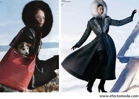 La protagonista que modela esta propuesta es Raquel Zimmerman, quien seria posa impasible mirando a un horizonte frío e inanimado, intentando tocar con ayuda de una escalera una gran figura de hielo con forma de pino, y su bota, ostentando pisar la huella que algún animal dejó marcada en la nieve albina.