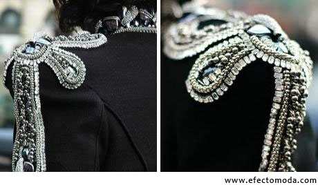 Para ciertos diseños funciona como un toque de superioridad y elegancia llamativa. Sobre la tela de estas hombreras que producen un ligero volumen, los adornos no solo son recurrentes sino que también representan un plus de sofisticación.