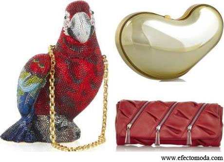 Asimismo, por ser un complemento dentro del outfit, no resulta de mal gusto que sus formas divertidas sean lo más estrafalario o llamativo en él, como seguramente es el caso de quien lleva el Judith Leiber, bolso con forma de perico mostrado a la izquierda de la fotografía. Predominantemente en color rojo, se combina con el amarillo, blanco, azul y negro en piedrecillas de crystal que le dan una embellecida apariencia brillante y exótica. Tiene un precio de 5,695 dólares y es una buena idea acompañarlo con prendas negras y más discretas.