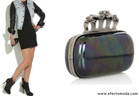Se trata de un clutch Alexander McQueen llamado Knuckle Duster, cuya superficie brillante refracta la luz y logra así una apariencia elegante y sofisticada, sumamente apropiada para ocasiones formales.