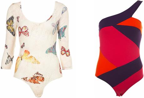 El diseño blanco con mariposas tiene un precio de 25 libras está hecho de nylon en su 100% y puede lavarse perfectamente a lavadora, mientras que la pieza multicolor a su lado de un solo hombro tiene un precio de 22 libras y está hecho 95% algodón y 5% elástico.