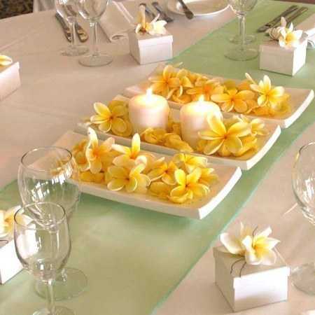 Luego debes repartir las flores entremezclando con las luces y esparcirlas a lo largo de toda la parte central de la mesa armando una especie de camino. Listo a disfrutar de vuestro arreglo y una agradable comida con amigos!.