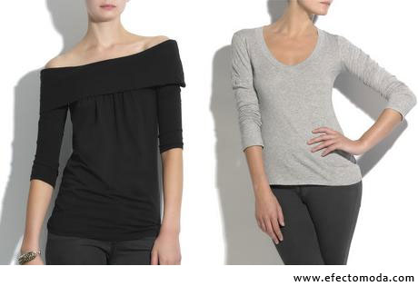 La de la derecha de cuello «v» y manga larga, está hecha de algodón en color gris claro. Su ventaja es que es una prenda ligera y fresca, suave al tacto y de estilo estándar, adecuado tanto para un outfit sport si se le lleva con pants, zapatillas deportivas y hoodie, o bien más causal, si se acompaña con falda, bufanda y zapatos planos. Tiene un accesible precio de 50 libras, mientras que el top a la izquierda (igualmente de algodón), cuesta 75 libras.