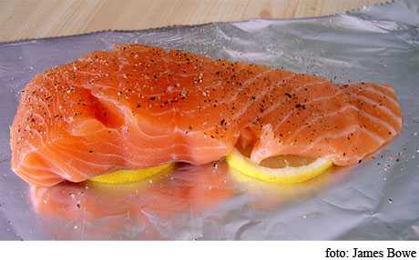 Colocaremos el zumo del limón en un recipiente, junto con el queso blanco, y la salsa blanca light, la mostaza, el edulcorante, y salpimentamos a gusto, ligamos todos los ingredientes, y luego con esta preparación obtenida rociaremos las postas de salmón, las cuales deberemos con anterioridad colocar sobre el papel de aluminio, para evitar que durante la cocción se derrame el líquido. Cerramos el papel de aluminio cubriendo todo el salmón y llevamos a horno en una asadera apta, durante unos 40 minutos aproximadamente.