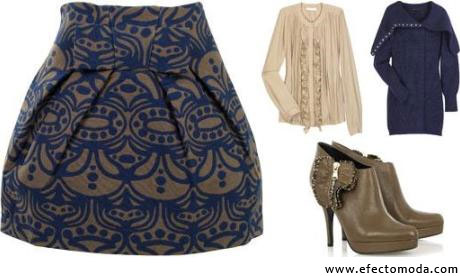 Lo adornos también aparecen en cuanto a los estampados se refiere. Grecas y figuras forman patrones que fácilmente responden al estilo vintage, como la que podemos ver a la izquierda. Se trata de un diseño ubicado en polyvore.com con el nombre de Hoss Intropia scroll print, minifalda que tiene un precio de 115 libras e ideal para eventos nocturnos.