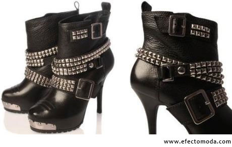 Bajo el nombre de Skint, estos botines de tacón alto son perfectos para un look rockero o de tendencia gótica. Las tiras de estoperoles favorecen a una apariencia imponente y chic, lo que aunado con las hebillas rectangulares podrá lograr fácilmente un outfit agresivo.