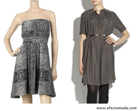 Toma como ejemplo el primer vestido de Maje con impresiones de piel de serpiente, que se encarga de poner un pedazo de la misma tela del resto del vestido a forma de cinturón, ciñendo la forma allí, mientras que la parte del pecho y de las cadera se ven más anchas debido a los prenses que tiene. Mientras que el segundo, de Burberry, utiliza un cinturón externo para hacer lo mismo de destacar la forma de la cintura.