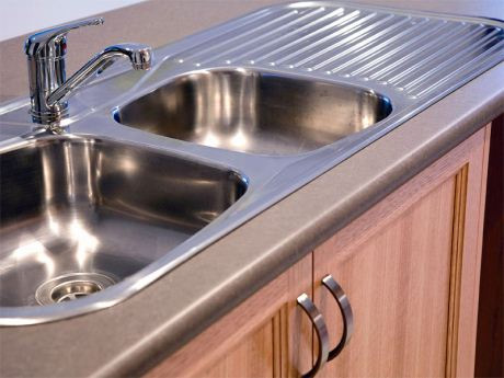 Por lo general el detergente y los desinfectantes diluidos en agua sirven muy bien para la limpieza de la zona de aguas en la cocina, pero las manchas rebeldes a veces no se quitan del todo, para ello podemos utilizar una esponja húmeda embebida en bicarbonato de sodio y frotar suavemente hasta quitarlas.