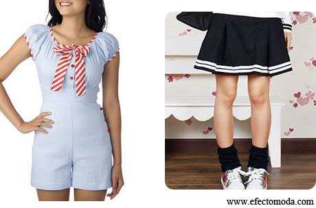 A las faldas arriba de la rodilla, les basta ser de doble tablón en la cara frontal y tener un par de rayas blancas, para ser identificadas con la moda marinera.