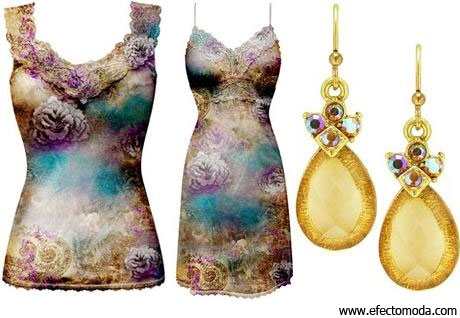 Asimismo, estas prendas pueden formar parte de la tendencia naïf, gracias a sus colores y azul corte. El escote no es extravagante, pero es muy sensual, el encaje aunque se disimula con el resto de la tela, es ornamental y refinado. La sofisticación de las prendas corre a cargo, desde luego, del estampado difuminado, en el que el color oro al que se debe cierto toque de moda barroca.
