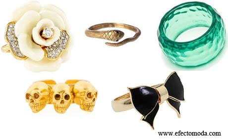 Los anillos de colores claros, como el de la esquina superior derecha de la fotografía, irán bien con atuendos de descanso o matutinos. Proyectan alegría y si juegan con texturas, como es el caso del de la imagen, suelen sumarte elegancia juvenil.