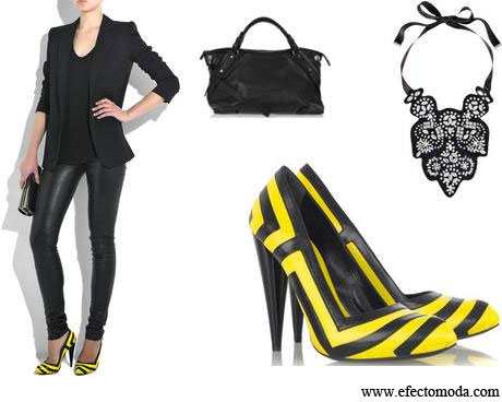 Por ser cromáticamente llamativos se pueden llevar con un atuendo muy limpio, por ejemplo, completamente negro. La joyería dorada no es muy buena idea en este caso porque no sigue el mismo estilo que el color amarillo de los zapatos, que aunque es brillante a la vista, el material es mate.
