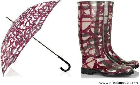 La sombrilla tricolor que vemos en la fotografía es una buena alternativa para lograr este efecto de moda del que estamos hablando. Compuesta por los colores vino, gris y blanco, tiene un estampado con figuras de corazones y líneas, cuyo estampado conforma un estilo alegre pero más o menos recatado por sus tonos. Tiene un precio de 25o dólares y precisamente hace juego con las botas plásticas de lluvia que la firma ya había lanzado anteriormente.