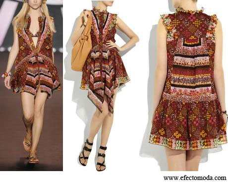 El vestido que vemos en la imagen es una pieza muy característica del estilo boho-chic, además de que juega con diferentes formas en su estampado y tiene un corte asimétrico y poco común.