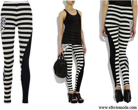 El patrón base son la rayas blancas y negras acomodadas horizontalmente. En el costado derecho, un poco más abajo de la cadera, tienen una especie de parche con patrón de animal print, mientras que la pierna izquierda cuenta con una franja negra que inicia a la misma altura que el parche y termina en el tobillo.