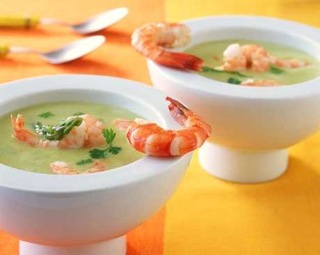 Pelar el aguacate y cortar en trozos, colocarlo en el vaso de la licuadora con el diente de ajo y añadir un poco más de caldo, el yogur, la pimienta, la sal. Batir muy bien, dejar enfriar y servir con las gambas adornado con lonjitas finas de aguacate.