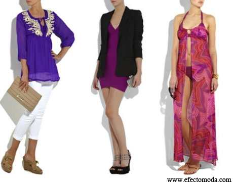 Una buena forma de añadir el color púrpura a tu atuendo veraniego es con una túnica como esta de Leaves of Grass que está hecha de una mezcla entre seda y chifón que se ve muy bien mezclada con un pantalón a media pierna y unas sandalias. Si quieres un vestido completo puedes comprar uno como este de Hervé Léger ajustado y perfecto para los días de verano; y para completar un bikini de ese color como este de Melissa Odabash.