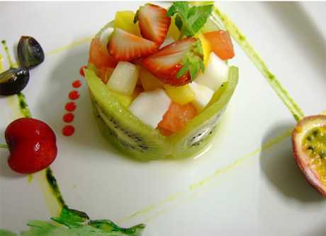 Picar las nueces y rociarlas sobre la macedonia, decorar con hojitas de menta.