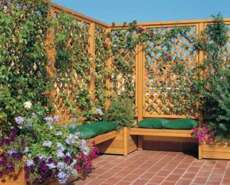 A la hora de escoger los materiales, conviene recordar que tendremos un aliado inmejorable en el aspecto decorativo: la propia vegetación del jardín. Una celosía revestida de plantas trepadoras nos ayudará en pocas semanas a camuflar de la manera más eficaz un soporte que a menudo tendrá por sí solo poca prestancia.