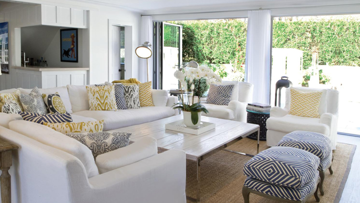 Nuevamente el protagonista sofá blanco tomará un aire juvenil y divertido si colocas en el respaldo un plaid o manta de colores y líneas verticales, complementa la decoración con dos cojines cuadrados blancos y uno circular de tu color preferido.