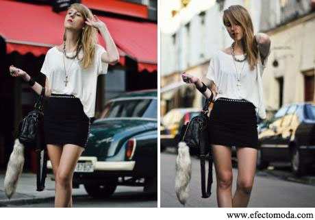 Si no te gustan las camisetas holgadas porque cubren y dan efecto de volumen al vientre, basta con meter parcial o totalmente esos bordes inferiores de la prenda, como sucede en el look de la chica en la fotografía. Su camiseta luce de esta manera asimétrica y trendy, y el color negro de la falda hace discreta un posible abdomen volumétrico.