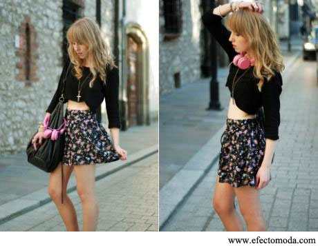 Rescatando algunos recursos distintivos de las tendencias retro, tenemos en este atuendo una camiseta crop coordinada con la minifalda ligeramente ampona que hasta ahora sigue estando vigente.
