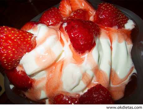 Trozar las fresas y mezclarlas con el yogurt y el edulcorante. Batir a mano o con batidora eléctrica hasta obtener una consistencia cremosa. Verter la preparación en un recipiente y enfriar.