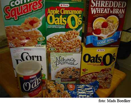 - Cereales con fibra, éstos cereales están formulados a base de salvado de trigo y maíz, y sus valores en fibra suelen ser más altos que los del resto, son recomendables para las personas que padecen de tránsito intestinal lento, y en una porción de 40 gramos aportan unas 95 calorías aproximadamente.