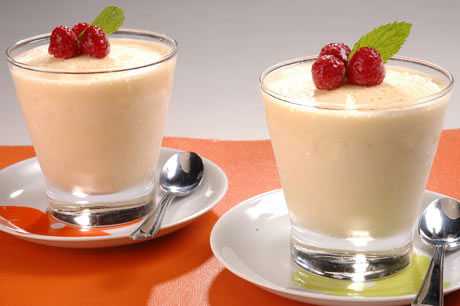 4 potes de yogurt desnatado sabor a vainilla, 1/2 vaso de vino marsala, 2 yemas, 1 cucharadita de esencia de vainilla, 1 pizca de pimienta rosa.