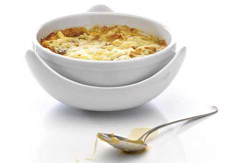 Dejar cocinar un buen rato, sazonar a gusto y retirar si se tiene el exceso de grasa, en el momento de servir la sopa ponerla en cuencos individuales con un par de rebanadas finas de pan tostado por persona y espolvorear por encima con el queso rallado, se puede gratinar si se desea. Si te agrada que la cebolla no se note, se podrá triturar antes de añadir el pan y el queso.