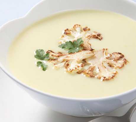 Servir la crema en cuencos individuales, decorar con las hojitas de coliflor y perejil.