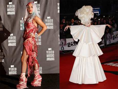 Para uno de los Grammys, uso un vestido plateado transparente con unos enormes zapatos que le hacían juego y un sombrero de langosta. Siempre en sus presentaciones y vídeos hace uso de diversas prendas, de conocidos diseñadores como en el vídeo de ¨Telephone¨, donde aparece con Beyonce. Pero lo que sí la hizo ver más que extravagante, fue el atuendo que llevo a la entrega de los MTV MVA que consistía en un mini vestido rojo, una corona llena de puntas y el rostro tapado con transparencias del mismo color.
